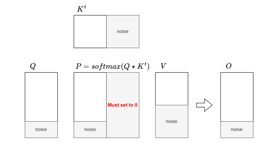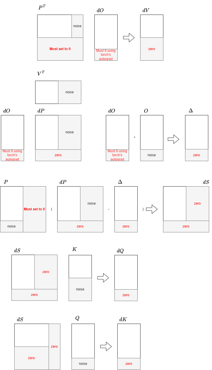 - During the gradient update $\mathbf{dK} += \mathbf{dS}^T \mathbf{Q}$, any non-zero dirty data in $\mathbf{Q}$ is multiplied by $\mathbf{dS} = 0$, yielding zero contribution.