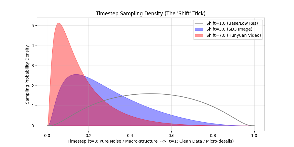 Visualization & Code Here is the Python script demonstrating how SD3 and Hunyuan mathematically shift their training focus away from the easy $t \approx 1$ regions. As the shift parameter increases for higher resolutions, the sampling probability stacks heavily on the left side ($t \approx 0$).