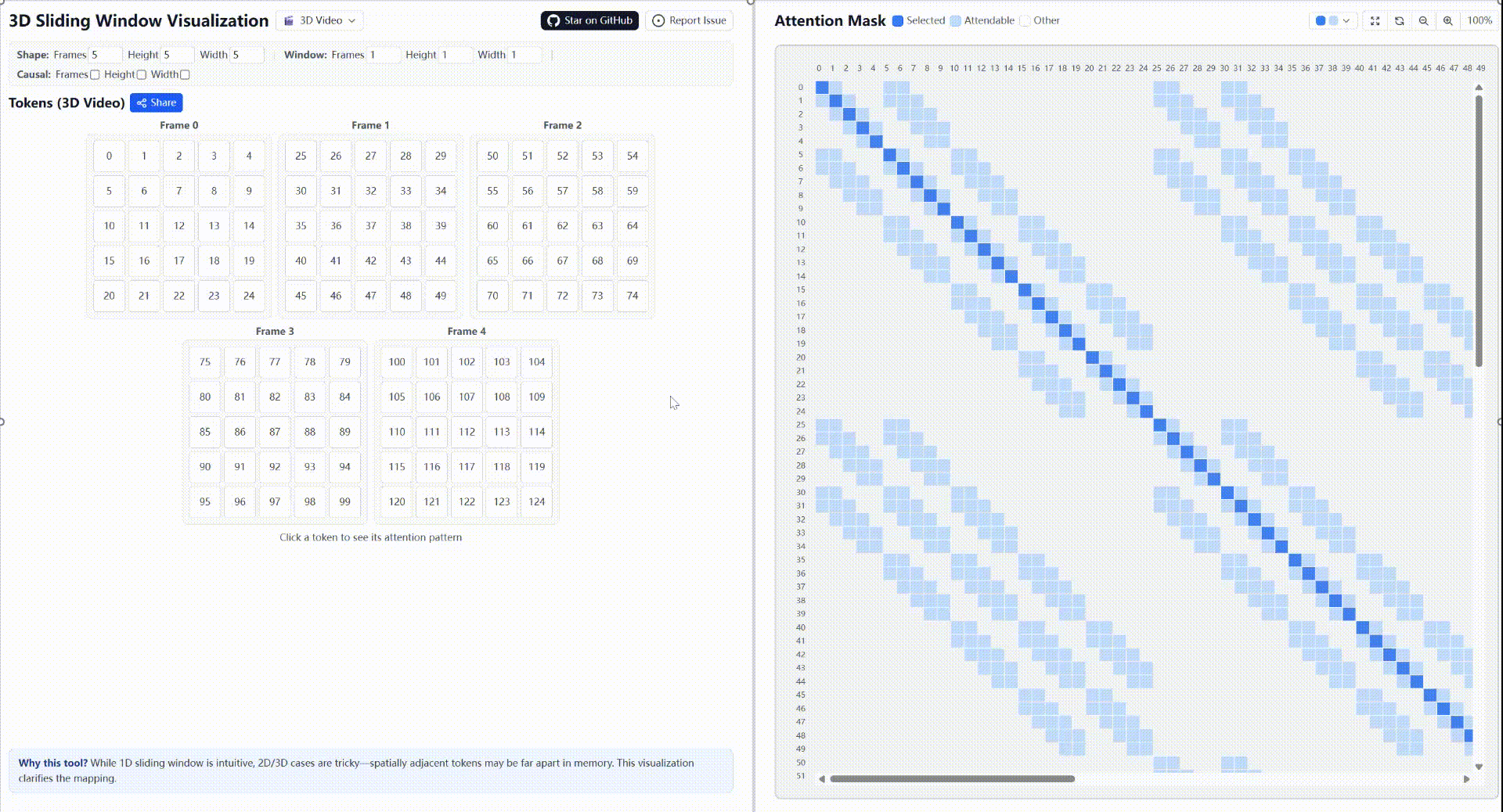 Fig. 1: Interactive Visualization Demo. Click on any token to see its neighbors. The tool highlights how a 3D sliding window maps to the flattened 1D sequence in real-time.